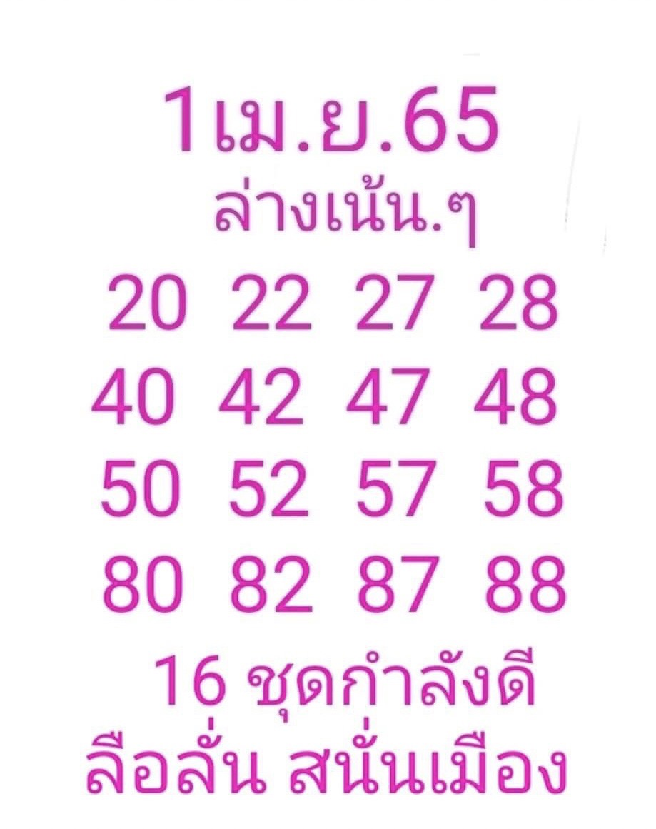 คัดมาแล้วเน้นๆหวย สลากกินแบ่งรัฐบาลสองตัวตรงงวดนี้ 1 เมษายน 2565 จากเพจดังอย่าง หวยแอดลือลั่นสนั่นเมือง ที่ก่อนหน้านี้ทางเพจได้ปล่อยเลขเด็ดสองตัวตรงมา 16 ตัว ให้คอหวยและนักเสี่ยงโชคได้ลองตามเลขที่ชอบพร้อมทั้งแนะเลขเน้นที่ทางเพจคิดว่าน่าลุ้นในงวดนี้