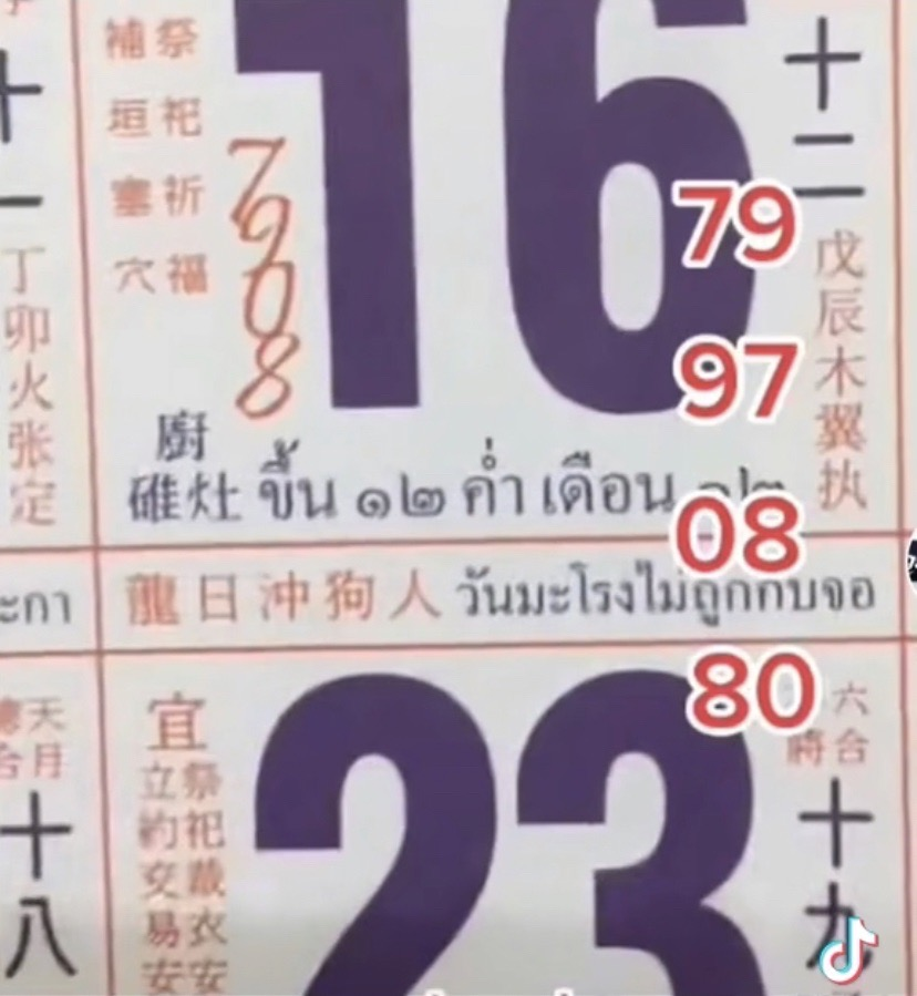 กลุ่มตัวเลขที่สามจาก หวยปฏิทิน 16 พฤศจิกายน 2564 คือ 7 – 9 – 0 – 8