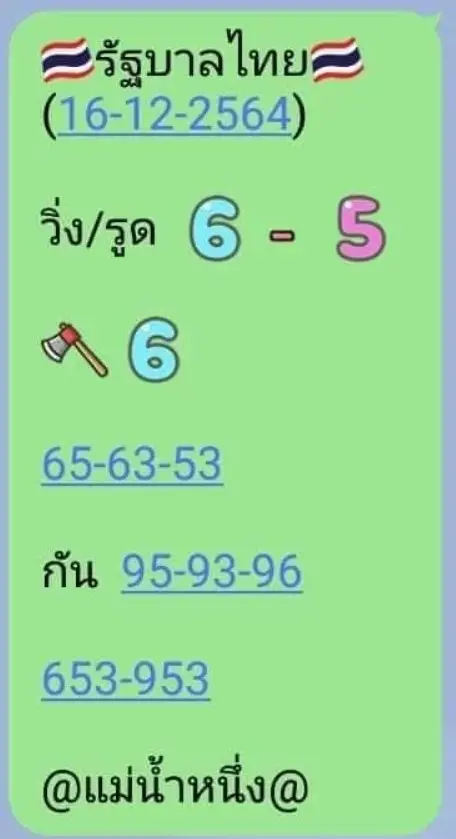 มาต่อกันที่เจ้าเด็ดเจ้าดังขวัญใจมหาชนอย่าง แม่น้ำหนึ่ง โดยเจ้าตัวได้ปล่อยออกมาเป็นเลขเด็ดสามตัวและสองตัวตรง โดยงวดนี้เน้นไปที่เลขเด็ด 6 – 5 เน้นสองตัวตรง 65 – 63 – 53 ซึ่งเจ้าตัวเน้นให้กันเอาไว้ด้วย 95 – 93 – 96 ส่วนเลขสามตัวตรง แม่น้ำหนึ่ง แนะไปที่เลขเด็ด 653 – 953
