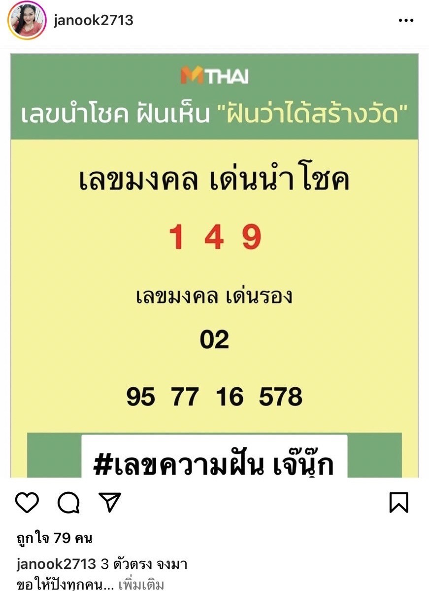 โดยงวดนี้ เจ๊นุ๊ก บารมีมหาเฮง ได้เผยว่าเจ้าตัวฝันว่าตัวเองได้มีการสร้างวัดเลยทำการค้นหาเลขเด็ดจากอินเทอร์เน็ตและได้มาเป็นเลขสองและสามตัวตรง แต่เจ๊นุ๊กจะเน้นไปแค่เลขสามตัวตรง ส่วนใครอยากจะลองตามเลขเด็ดสองตัวตรงเพิ่มเติมด้วยก็ได้เพราะมีแฟนคลับคอหวยบอกว่าให้เลขเยอะเกินไปให้ลดลงหน่อย เจ้าตัวเลยจะเน้นแค่สามตัวก่อน