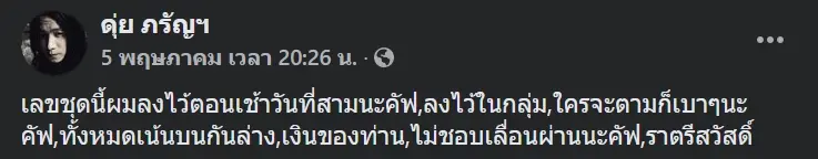 มาแล้ว ที่แรก หวยเด็ดดุ่ย ภรัญฯ งวด 16 พฤษภาคม 2564 ปล่อยเลขเด็ด น่าสนใจหน้าเฟสบุ๊ค ให้ชาวเน็ตนักเสี่ยงดวงได้ลองตามกัน ระวัง 3-8