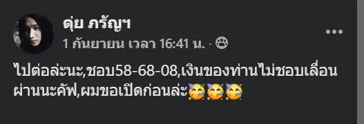 ซึ่งงวดนี้เจ้าตัวดูเริ่มมั่นใจว่าดวงเริ่มมาแล้ว พร้อมทั้งเดินหน้าฟันเลขเด็ดต่อเนื่องในงวดนี้ 16 กันยายน 2564 ให้มาครบเลขเด็ดสองตัวตรงและเลขที่ต้องระวังอาจจะมาในงวดนี้โดย ดุ่ย ภรัญฯ ก็ได้โพสต์ข้อความและรูปเพิ่มเติมว่า “ไปต่อล่ะนะ,ชอบ58-68-08,เงินของท่านไม่ชอบเลื่อนผ่านนะคัฟ,ผมขอเปิดก่อนล่ะ“