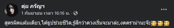 เดินหน้าฟันเลขเด็ดต่อเนื่องสำหรับเจ้าพ่อนักแนะแนวทางเลขเด็ดชื่อดัง ดุ่ย ภรัญฯ หลังจากงวดที่แล้ว 1 กันยายน 2564 เจ้าตัวพลาดไปแค่เลขเดียวเท่านั้น แต่เจ้าตัวก็ยังโพสต์ภาพพร้อมข้อความผ่านเฟสบุ๊คส่วนตัว ดุ่ย ภรัญฯ ว่า “สูตรผิดแต้มเดียว,ได้ธูปช่วยชีวิต,รู้สึกว่าดวงเริ่มจะมาล่ะ,งดดราม่านะจ๊”