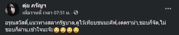 ล่าสุดเมื่อวานนี้ ดุ่ย ภรัญฯ ได้โพสต์ข้อความและรูปภาพผ่านเฟสบุ๊คส่วนตัว ดุ่ย ภรัญฯ ตัดเลขเด็ดเน้นๆมาให้คอหวยและนักเสี่ยงโชคได้ตัดสินใจง่ายมากขึ้นที่จะตามต่อในงวดนี้ 16 สิงหาคม 2564 ซึ่ง ดุ่ย ภรัญฯ ก็ได้บอกว่า “อรุณสวัสดิ์,แนวทางสลากรัฐบาล,ดูไว้เทียบชนนะคัฟ,งดดราม่า,ชอบก็จัด,ไม่ชอบก็ผ่าน,เข้าใจนะจ๊ะ“