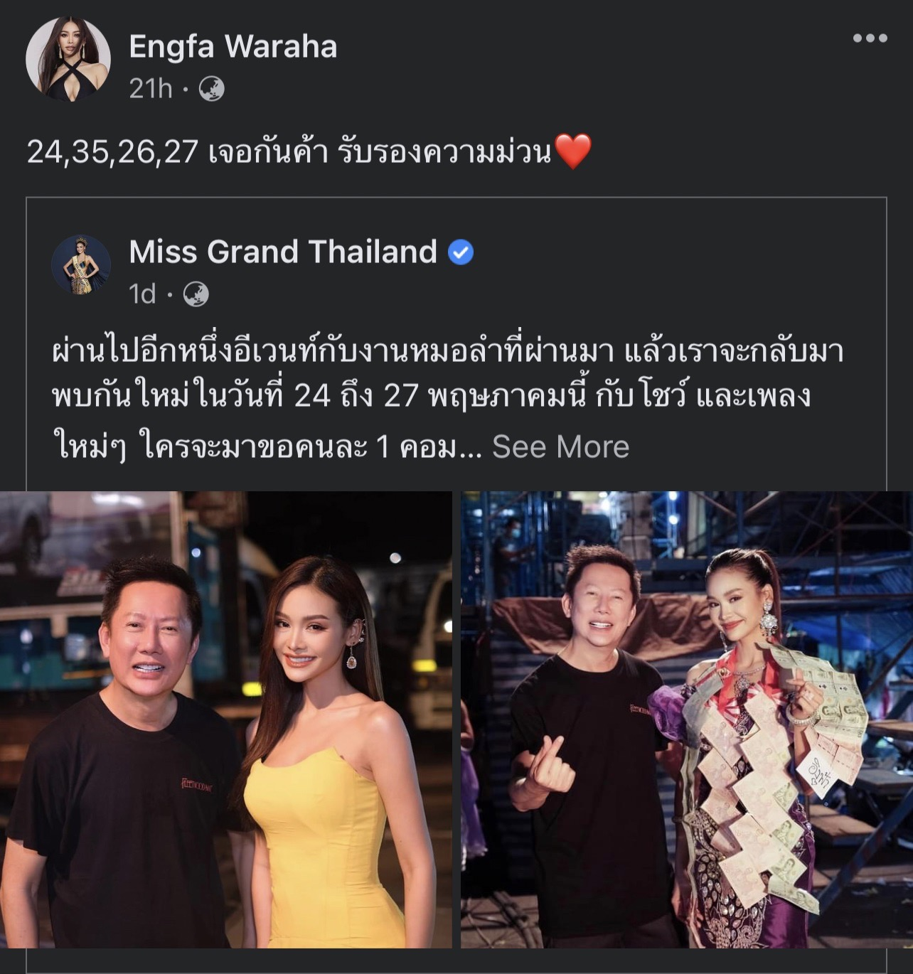 ล่าสุดเมื่อคืนนี้ อิงฟ้า วราหะ ได้โพสต์เชิญชวนเหล่าแฟนคลับให้ไปม่วนไปเซิ้งหน้าฮ้านเวทีหมอลำผ่านเฟสบุ๊คส่วนตัว Engfa Waraha แต่งานนี้ทำเอาเหล่าคอหวยและนักเสี่ยงโชครวมถึงเหล่าด้อม อิงฟ้ามหานคร เข้าไปคอมเมนต์แซวกันยกใหญ่ เนื่องจาก อิงฟ้า ดันพิมพ์วันที่แสดงผิดงานนี้ไม่มีพลาดเหล่าแฟนคลับก็คอมเมนต์เลยว่าหรือนี้คือการใบ้หวยเลขเด็ดงวดนี้หรือเปล่า ซึ่งเลขเด็ดเลขนั้นก็คือ 35 – 53 นั้นเอง