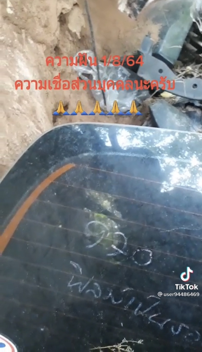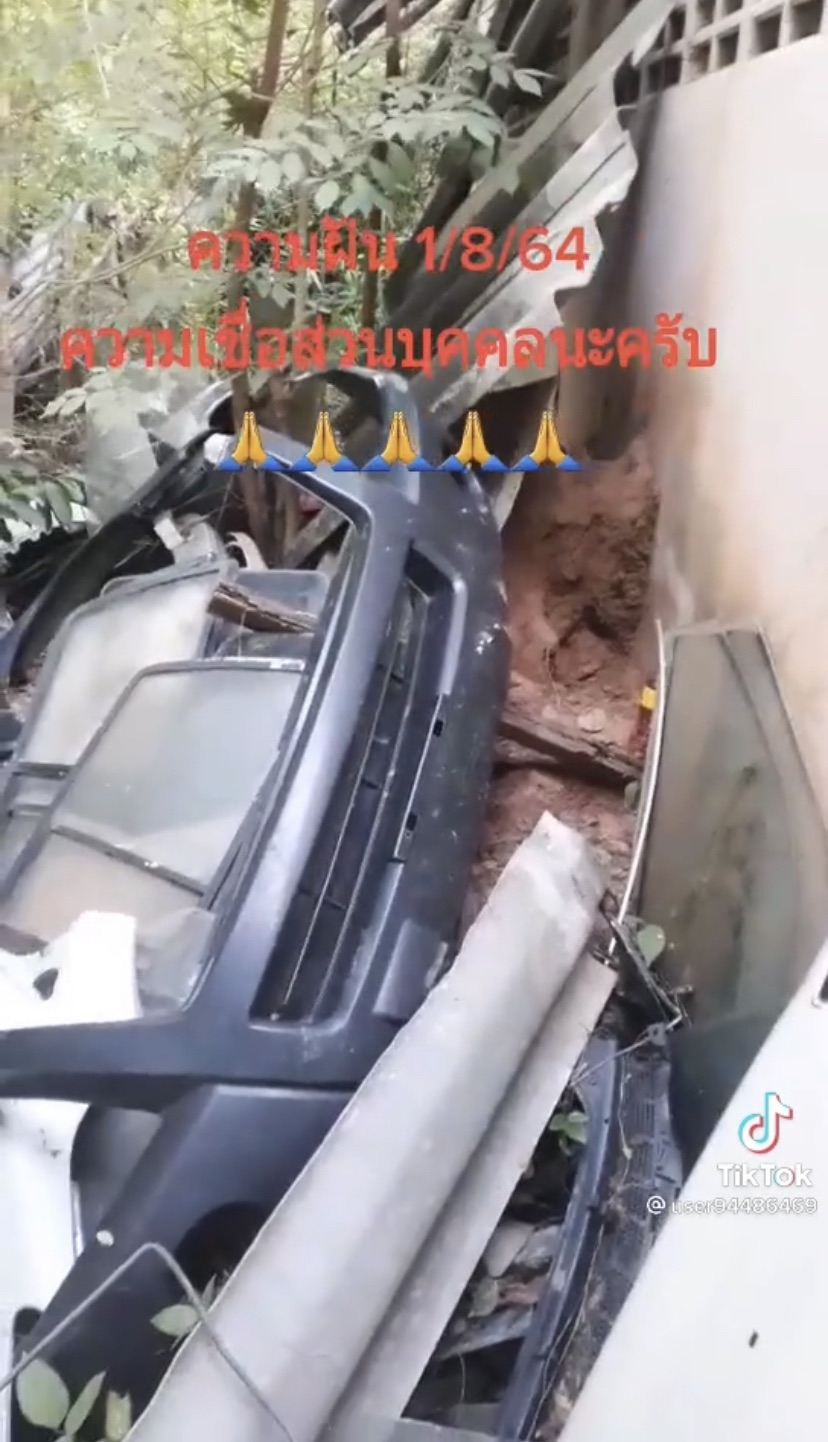 ซึ่งภายในคลิปเจ้าตัวก็เล่าว่า ตัวเองฝันว่าตัวเองนั่งทำงานอยู่แล้วมีผู้หญิงชุดขาวผมยาวถึงพื้นดีงแขนของเจ้าตัวเข้าไปตรงซากรถที่มีจอมปลวกใหญ่อยู่และเจ้าตัวก็บอกว่า ถ้าถูกงวดนี้เจ้าตัวก็อธิษฐานเอาไว้ว่าจะสร้างศาลให้