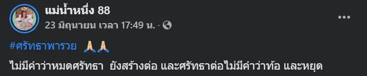 โดยเจ้าตัวได้โพสต์ข้อความผ่านเฟสบุ๊คส่วนตัวว่า “ศรัทธาพารวย ไม่มีคำว่าหมดศรัทธา ยังสร้างต่อ และศรัทธาต่อไม่มีคำว่าท้อ และหยุด”