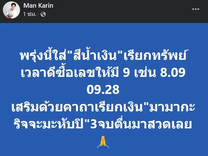 ล่าสุดเมื่อหนึ่งชั่วโมงที่ผ่านมาเฟสบุ๊คแฟนเพจ Man Karin ก็ได้อัปเดทข้อความสำหรับสายมูที่ติดตามอยู่ให้ลองนำเลขพวกนี้ไปใช้ในการลงทุนเสี่ยงโชคกัน ” พรุ่งนี้ใส่”สีน้ำเงิน”เรียกทรัพย์เวลาดีซื้อเลขให้มี 9 เช่น 8.09 09.28