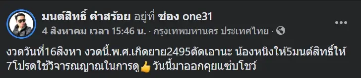 ยังคงมีเลขเด็ดมาให้คอหวยและนักเสี่ยงโชคได้ลองตามอย่างต่อเนื่องสำหรับนักร้องลูกทุ่งคอหวยคนดัง มนต์สิทธิ์ คำสร้อย ที่ถึงแม้งวดนี้ 16 สิงหาคม 2564 เจ้าตัวจะประกาศลั่นกลางเฟสบุ๊คส่วนตัว “มนต์สิทธิ์ คำสร้อย” ว่า อะโหล..ไม่ถูกเลยงวดนี้. สงสัยจะว่างมือแล้วหละ. เจ้งระนาดระนาว. ดีนะงวดนี้เล่นหมดไป4600-งวดหน้าหยุดก่อนโควิดระบาดหนัก เก็บเงินไว้ซื้อยากันยุงดีกว่างวดที่16สิงหาผมเลื่อนไปซื้องวดที่1กันยาเด้อ55555555