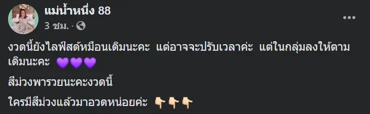 8 มิ.ย. 64 เจ้าแม่หวย แม่น้ำหนึ่ง หรือใครหลายๆคนรู้จักในนาม หวยแม่น้ำหนึ่ง งวดนี้ 16/6/64 ได้โพสต์ข้อความผ่านเฟสบุ๊คเจ้าตัว “แม่น้ำหนึ่ง88” แย้มเบาๆให้คอหวยนักเสี่ยงดวงสวมใส่ สีม่วง เสริมดวง เรียกทรัพย์ พร้อมทั้งได้พูดถึงเรื่องไลฟ์สดในงวดนี้ อาจจะมาไลฟ์เร็วกว่าเดิม ไม่ให้ชาวเน็ตรอช้า จะได้รีบหาซื้อก่อนหวยออก