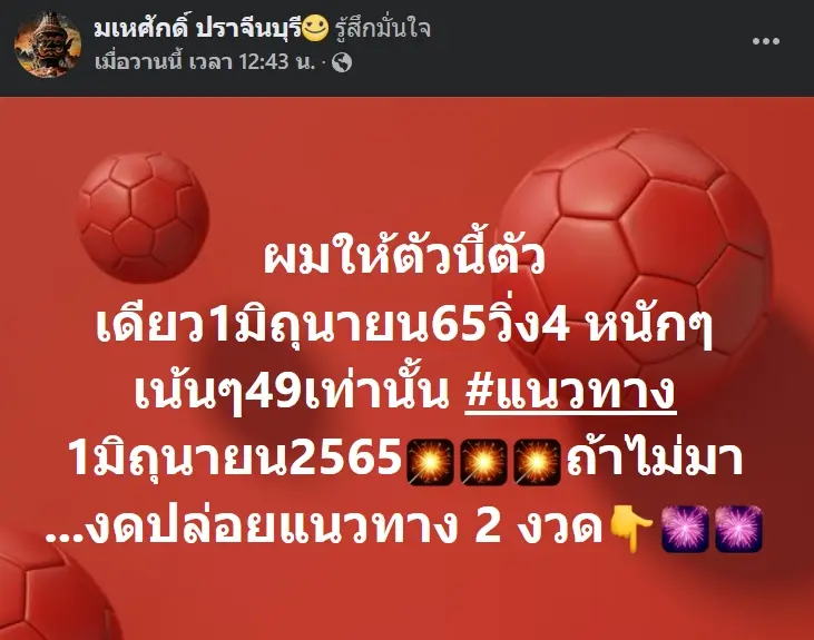ล่าสุดเมื่อวานนี้ 27 พฤษภาคม 2565 พ่อน้ำสอง ก็ได้โพสต์รูปภาพและข้อความผ่านเฟสบุ๊คส่วนตัว มเหศักดิ์ ปราจีนบุรี ว่า ” ผมให้ตัวนี้ตัวเดียว1มิถุนายน65วิ่ง4 หนักๆเน้นๆ49เท่านั้น #แนวทาง 1มิถุนายน2565ถ้าไม่มา …งดปล่อยแนวทาง 2 งวด “ โดยแนวทางงวดนี้เลขเด็ด หวยพ่อน้ำสอง วางแนวทางเลขวิ่งเด่น 4 และยังมีเลขเด่นอีกหนึ่งชุดคือ 3 – 6 ให้รีบวิ่งไปซื้อเจ้าตัวออกตัวแรงขนาดนี้มั่นใจมาแน่นอน