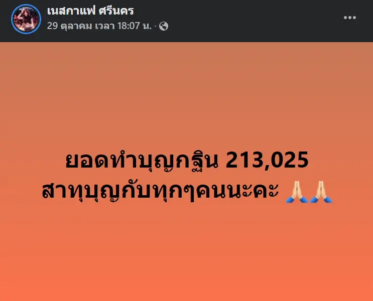 ซึ่งก่อนหน้านี้เมื่อวันที่ 29 ตุลาคม 2564 เซียนเนสกาแฟ ก็ได้โพสต์ยอดทำบุญของเจ้าตัวและแฟนคลับผ่านเฟสบุ๊คส่วนตัว เนสกาแฟ ศรีนคร แล้วก็มีคอหวยนำเลขจากยอดทำบุญไปเสี่ยงโชคสามตัวตรงกันเต็มไปหมดซึ่งยอดทั้งหมดก็คือ 213,025 บาท