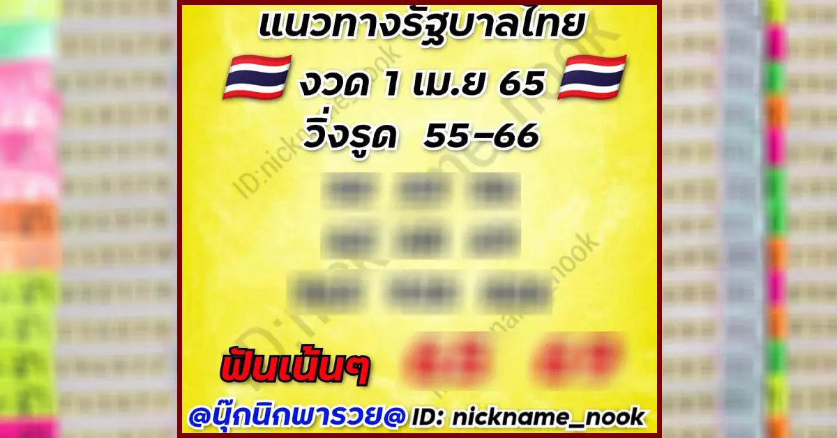 โดยงวดนี้ 1 เมษายน 2565 เลขเด็ดงวดนี้นุ๊กนิกพารวย เน้นๆเลขเด็ดไปที่ 5 – 6 โดยแบ่งเป็นเลขเด็ดสองและสามตัวตรงดังนี้