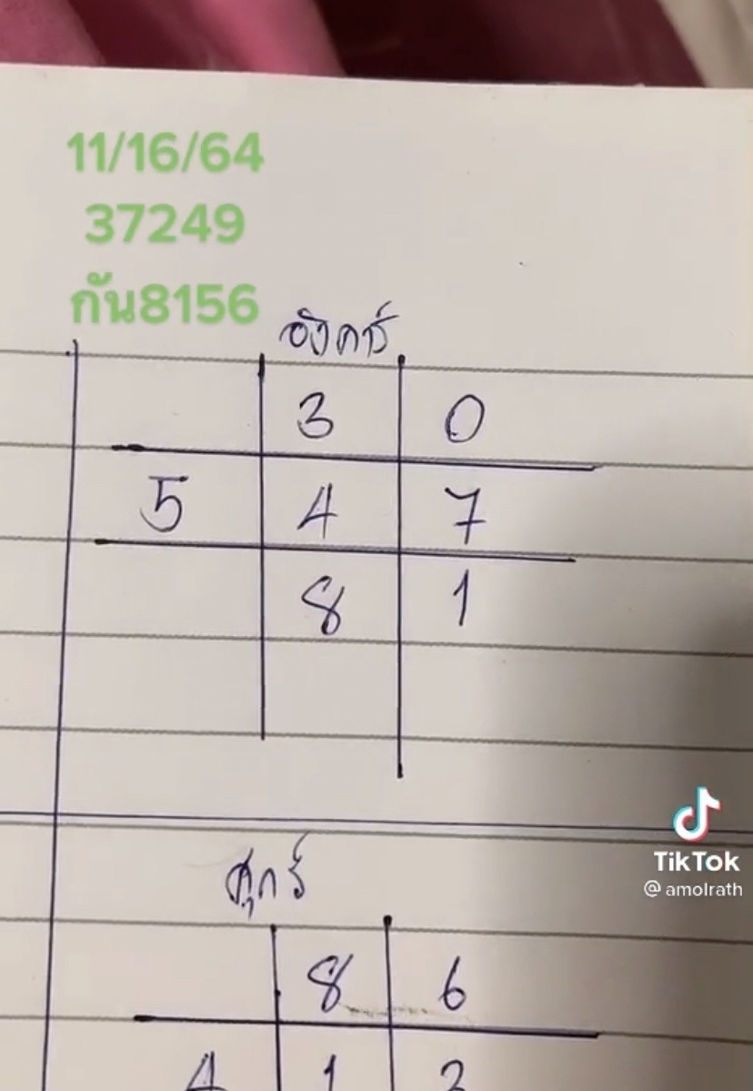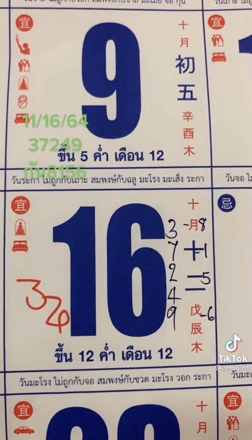 ล่าสุด User Tiktok : Milk Soda ก็ได้ออกมาแชร์คลิปเลขเด็ดจาก หวยปฏิทิน และเลขเด็ด หวยกำลังวัน ให้คอหวยและนักเสี่ยงโชคได้ตามเสี่ยงโชคกันในงวดนี้ 16 พฤศจิกายน 2564 ซึ่งเลขเด็ดจาก หวยปฏิทิน งวด 16 พฤศจิกายน 2564 ก็คือเลข 3 – 7 – 2 – 4 – 9 ซึ่งเจ้าตัวก็ยังแถมเลขกันมาให้อีกด้วยโดยสามารถตีเป็นเลขเด็ดได้ดังนี้ 3=8,7=1,4 9 = 6