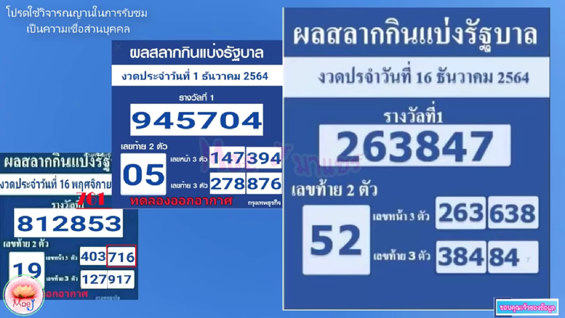 โดยในรอบนี้ แม่เจ มาแชร์ หรือ MaeJ มาแชร์ นักแนะแนวตัวเลขและรวบรวมเลขเด็ด คนดังจากยูทูปที่มีผู้ติดตามกว่า 7 หมื่นคน ก็ได้ออกมาแชร์ เลขทดลองออก ให้คอหวยได้ชมกัน สำหรับสลากกินแบ่งรัฐบาลงวด 16 ธันวาคม 2654 นี้ เลขทดลองออกให้เลข 847 – 52 เป็นเลขทดลองที่น่าจะออกผลรางวัลในงวดนี้
