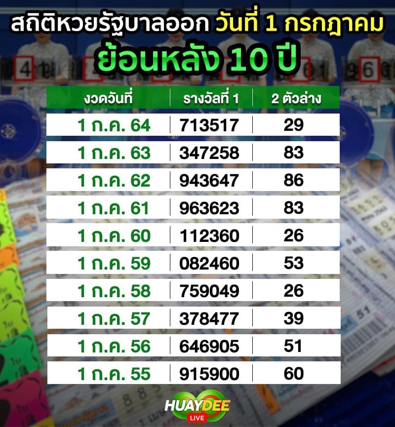 กระแสยังมาแรงและคอหวยและนักเสี่ยงโชคก็ยังคงตามเลขเด็ดจาก สถิติหวย เป็นส่วนใหญ่ ด่วนล่าสุด ไบรท์ทูเดย์ (Bright today) นำ สถิติหวย ออกวันที่ 1 กรกฎาคม ย้อนหลัง10ปี มาให้คอหวยและนักเสี่ยงโชคได้รู้ก่อนใครว่าเลขเด็ดเลขไหนน่าซื้อและคาดว่ามีสิทธิ์ออกมากที่สุด