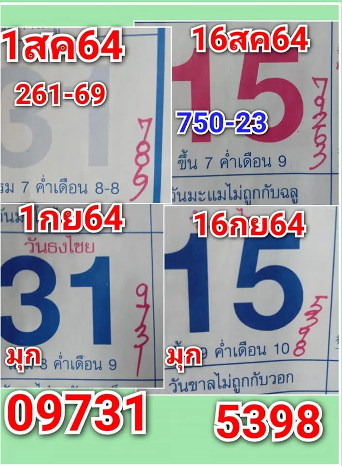 16 สิงหาคม 2564 เลขในปฏิทินคือ 7 9 2 5 3 – ผลสลากกินแบ่งรัฐบาล รางวัลที่ 1 คือ 046750 และเลขท้าย 2 ตัว คือ 23