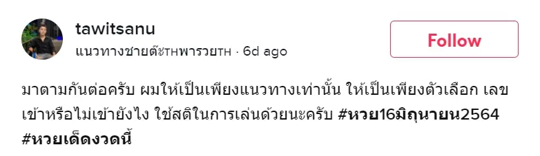 มาแรงสำหรับนักเสี่ยงดวงชื่อดังในแอป Tiktok user “tawitsanu” หรือที่ชาวติกต๊อกรู้จักกัน แนวทางชายต๊ะ🇹🇭พารวย🇹🇭 ซึ่งในงวดนี้ 16/6/64 เจ้าตัวได้ให้เลขเด็ดทั้งสองตัวตรงและสามตัวตรงมาให้นักเสี่ยงดวงและคอหวยเรียบร้อยแล้ว