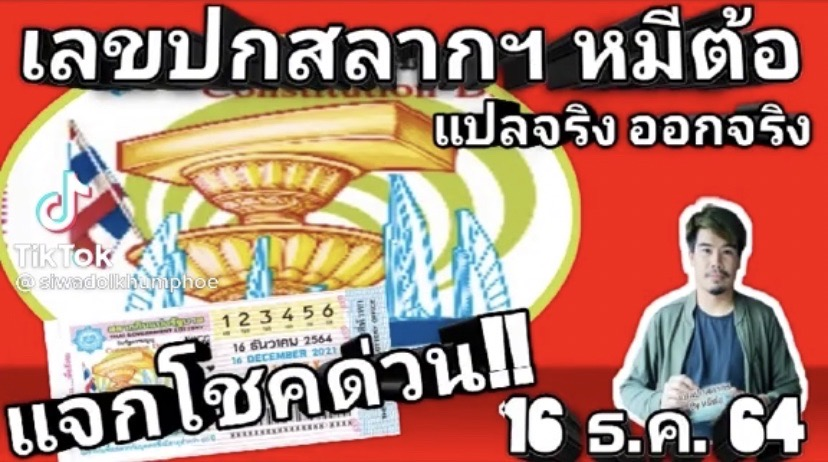 โดยผู้ใช้ User Tiktok : partysiwadol ได้โพสต์คลิป รูปปกสลากกินแบ่งรัฐบาล ของงวดนี้ 16 ธันวาคม 2564 และได้ทำการแปลเลขเด็ดจากรูปของสลากกินแบ่งรัฐบาลในงวดนี้ออกเป็นเลขเด็ดสองและสามตัวตรงดังนี้