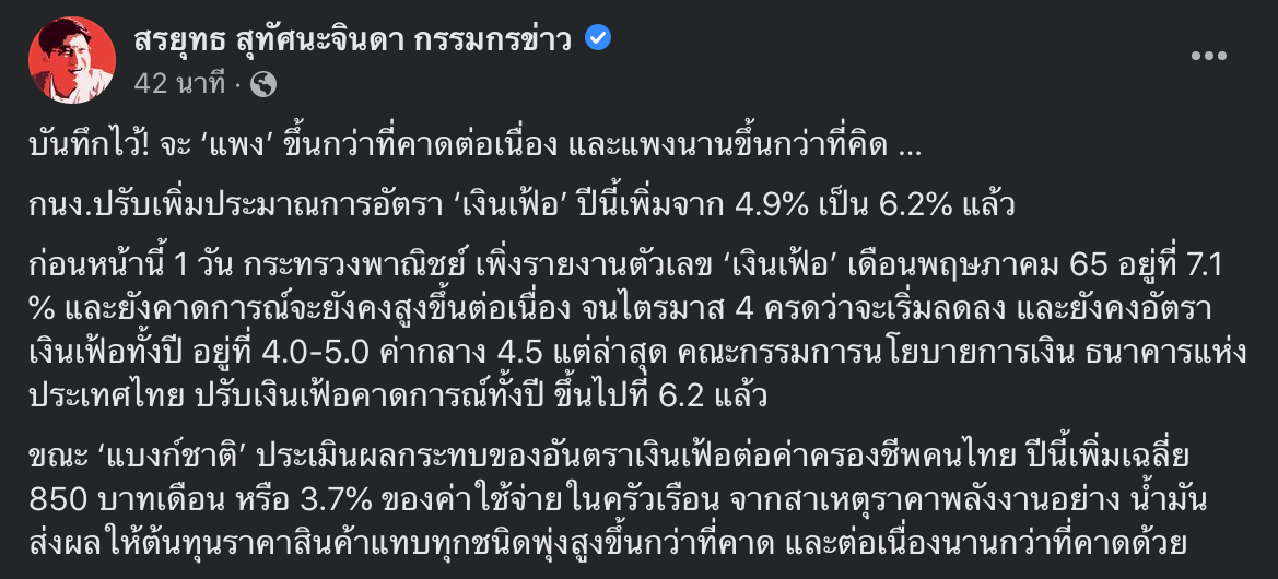 ล่าสุด 09 มิ.ย. 65 เพจ สรยุทธ สุทัศนะจินดา กรรมกรข่าว ได้โพสต์ข้อความให้ความรู้เกี่ยวกับปัญญา เงินเฟ้อ ที่มีอยู่ในขณะนี้ โดยให้ข้อมูลไว้ว่า