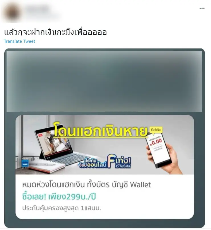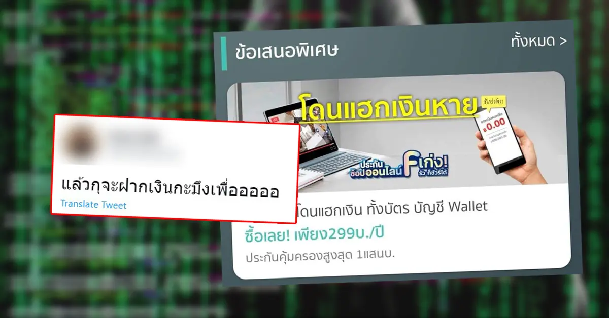 ล่าสุดก็ได้มีผู้ใช้ทวิตเตอร์รายหนึ่งออกมาแชร์ภาพจากแอพธนาคารสีเขียวชื่อดัง ซึ่งในภาพเป็นภาพที่ทางธนาคาร โฆษณาขาย ‘ประกันโดนแฮกเงินหาย‘ จากบัญชี หมดห่วงเรื่องโดนแฮกเงิน ปีละ 299 บาท คุ้มครองสูงสุด 1 แสนบาท!