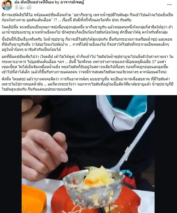 ชาบู — อาจารย์เจษฎ์ รศ.ดร.เจษฎา เด่นดวงบริพันธ์ โพสต์ผ่านเฟซบุ๊ก อ๋อ มันเป็นอย่างนี้นี่เอง by อาจารย์เจษฎ์ กรณี มีการแชร์คลิปวิดีโอ พร้อมแคปชั่นเตือนห้าม “อย่ากินชาบู เพราะน้ำซุปมีไขมันสูง กินเข้าไปแล้วจะไปแข็งเป็นก้อนในร่างกาย อุดตันเส้นเลือด” ??