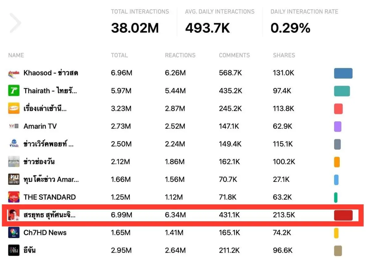 เพจ ‘สรยุทธ สุทัศนะจินดา กรรมกรข่าว’ มียอดการมีส่วนร่วม (Engagement) ทั้งสิ้น 6.99 ล้านครั้ง ขึ้นเป็นอันดับ 1 ในกลุ่มเพจข่าว โดยแบ่งการกดไลก์ 6.3 ล้าน , การคอมเมนต์ 431.1 แสนครั้ง และยอดแชร์จำนวน 213.1 แสนครั้ง
