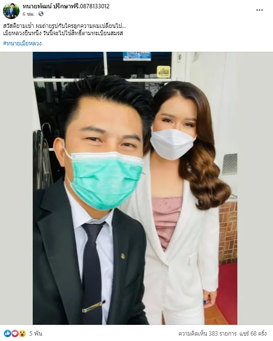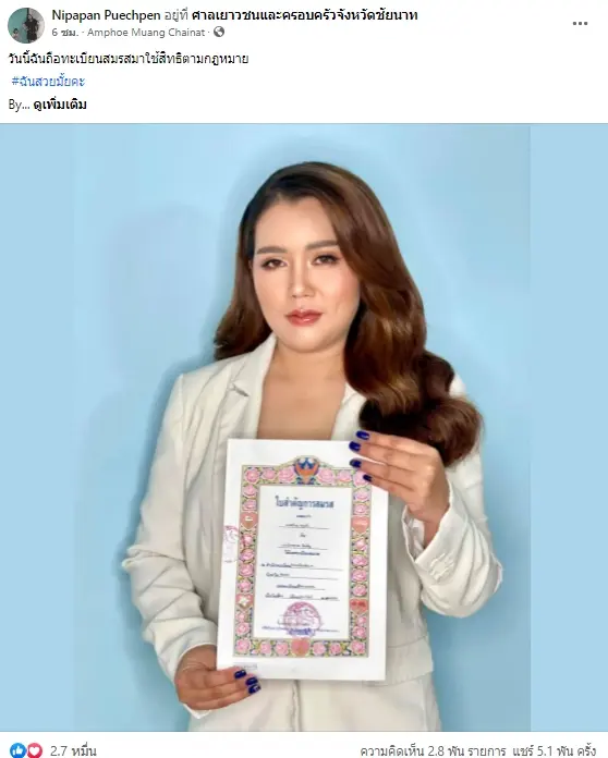 ล่าสุดเธอได้ออกมาเคลื่อนไหวอีกครั้งหลังจากที่จบคอร์สอัพหน้า อัพตัวตามคอนเซป โมทั้งตัวให้ผัวเสียดาย โดยโพสต์ภาพตัวเองคู่กับทะเบียนสมรส พร้อมกับระบุข้อความว่า “วันนี้ฉันถือทะเบียนสมรสมาใช้สิทธิตามกฎหมาย” และได้รับความสนใจจากชาวเน็ตมากมาย