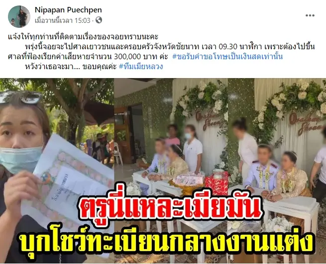จอย เมียหลวงบุกงานแต่ง โพสต์ภาพคู่ทะเบียนสมรส พร้อมขึ้นศาลฟาดเมียน้อยอดีตรักเก่า พร้อมติดแฮชแท็ก รับคำขอโทษเป็นเงิน