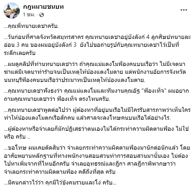 ล่าสุด ทนายชนบท โพสต์ข้อความถึง ทนายเดชา ผ่านช่องทางเฟซบุ๊ก กฎหมายชนบท ระบุว่า คุณพี่ทนายเดชาครับ วันก่อนที่ศาลจังหวัดสมุทรสาคร คุณทนายเดชาอยู่บังลังก์ 4 ลูกศิษย์ทนายละอ่อน 3 คน ของผมอยู่บังลังก์ 3 ยังไปขอถ่ายรูปกับคุณทนายเดชาไว้เป็นที่ระลึกเลยครับ ผมดูคลิปที่ท่านทนายเดชาว่า ถ้าคุณแม่แตงโมฟ้องคนบนเรือว่า ไม่มีเจตนาฆ่าแต่มีเจตนาทำร้ายจนเป็นเหตุให้น้องแตงโมตาย แต่พนักงานอัยการจังหวัดนนทบุรีฟ้องคนบนเรือว่าประมาทเป็นเหตุให้น้องแตงโมตาย