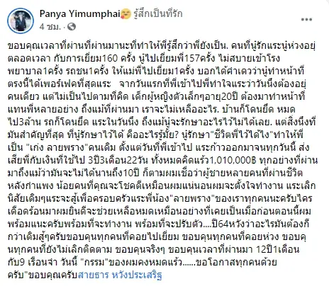 “ขอบคุณเวลาที่ผ่านที่ผ่านมานะที่ทำให้พี่รู้สึกว่าพี่ยังเป็น. คนที่นู๋รักแระนู๋ห่วงอยุ่ตลอดเวลา กับการเยี่ยม160 ครั้ง นู๋ไปเยี่ยมพี่157ครั้ง ไม่สบายเข้าโรงพยาบาล1ครั้ง รถชน1ครั้ง ให้แม่พี่ไปเยี่ยม1ครั้ง บอกได้คำเดวว่านู๋ทำหน้าที่ตรงนี้ได้เพอร์เฟคที่สุดแระ