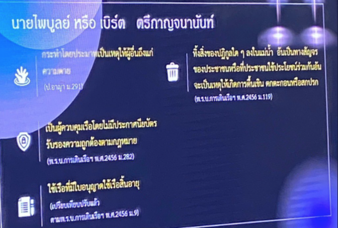 - เป็นผู้ควบคุมเรือโดยไม่มีประกาศนียบัตรรับรองความถูกต้องตามกฎหมาย ( พ.ร.บ. การเดินเรือฯ พ.ศ.2456 ม.282 )