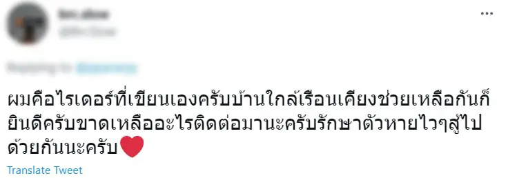 แม้ว่าตอนแรกเธอจะสงสัยอยู่ว่า ไม่รู้ว่าเป็นไรเดอร์หรือร้านค้าที่เขียนข้อความให้ แต่อย่างไรก็ตาม ล่าสุดไรเดอร์คนที่เขียนจดหมายน้อยก็ได้ออกมาคอมเมนท์ตอบกลับเจ้าของโพสต์ ว่าเป็นคนเขียนให้เองเพราะบ้านใกล้เรือนเคียง ทั้งยังบอกอีกว่า หากขาดเหลืออะไรให้ติดต่อมา รักษาตัวหายไว ๆ สู้ไปด้วยกัน