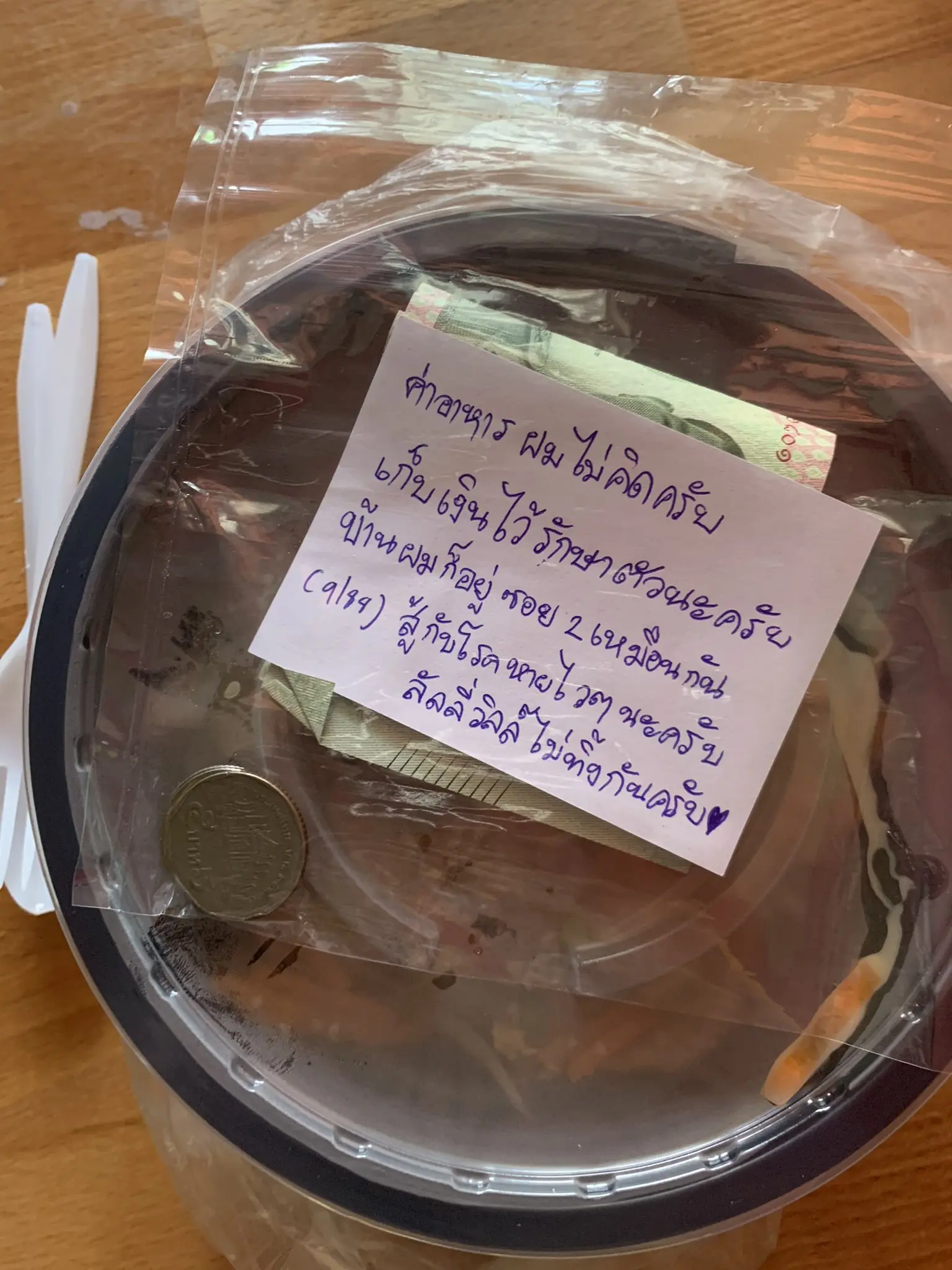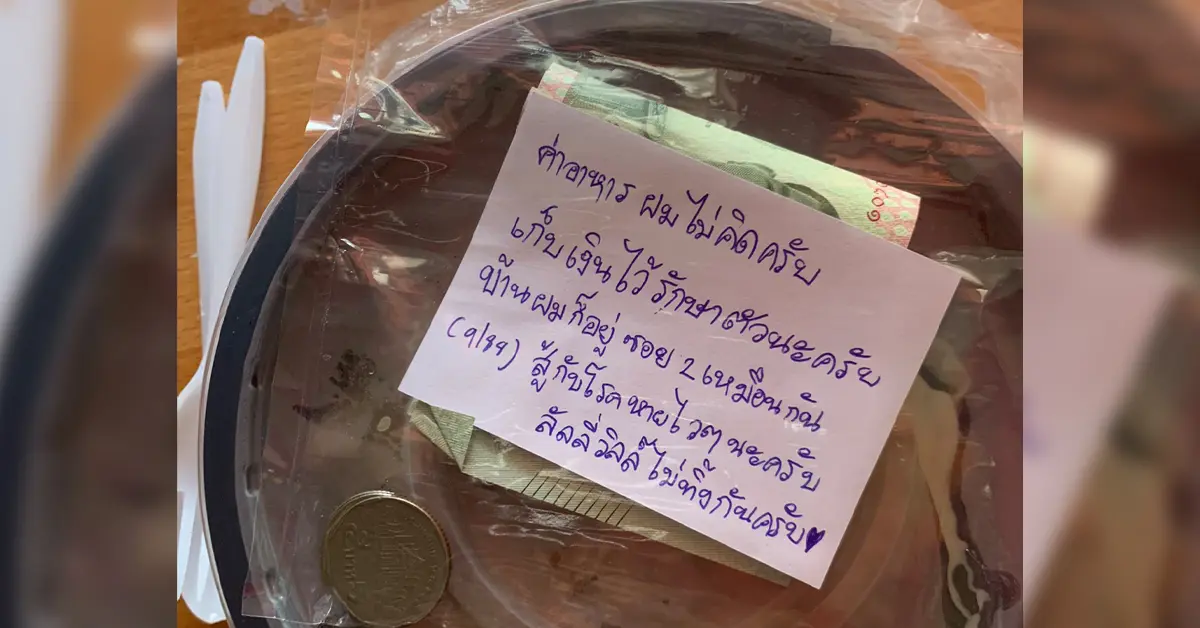 โดยในกระดาษ เป็นข้อความน่ารัก ๆ ที่ใครอ่านแล้วก็ต้องมียิ้มออกนะแน่นอน ระบุว่า “ค่าอาหารผมไม่คิดครับ เก็บเงินไว้รักษาตัวนะครับ บ้านผมก็อยู่ซอย 2 เหมือนกัน สู้กับโควิดหายไว ๆ นะครับ” พร้อมกับลงท้ายด้วยหัวใจ