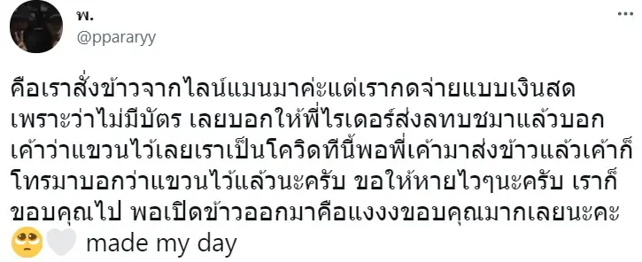 ผู้ใช้ทวิตเตอร์ชื่อว่า พ.@ppararyy ได้โพสต์เรื่องราวสุดประทับใจ เมื่อเธอสั่งอาหารมาทาน แต่กลับเจอไรเดอร์ใจดีออกค่าอาหารให้แถมยังทิ้งเงินจำนวนหนึ่งไว้ให้รักษาตัว! เจ้าของโพสต์ระบุว่า “คือเราสั่งข้าวจากไลน์แมนมาค่ะแต่เรากดจ่ายแบบเงินสดเพราะว่าไม่มีบัตร เลยบอกให้พี่ไรเดอร์ส่งลทบชมาแล้วบอกเค้าว่าแขวนไว้เลยเราเป็นโควิดทีนี้พอพี่เค้ามาส่งข้าวแล้วเค้าก็โทรมาบอกว่าแขวนไว้แล้วนะครับ ขอให้หายไวๆนะครับ เราก็ขอบคุณไป พอเปิดข้าวออกมาคือแงงงขอบคุณมากเลยนะคะ made my day“