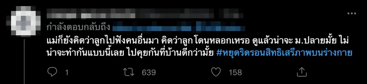 “เมื่อกี๊นั่งรถไฟฟ้ากลับบ้านแล้วเจอน้องคนนึงทะเลาะกับแม่ คือสงสารน้องมาก น้องโดนแม่บังคับไปตัดผมแล้วน้องไม่ยอม แม่ก็คือกระชากน้องกลางรถไฟฟ้าเลยจ้า คือเหมือนน้องจะร้องไห้แล้วอ่ะ สมัยนี้มันยังมีกฎบังคับเด็กตัดผมอยู่ด้วยอ่อวะ สงสารน้องจริงๆ #ยกเลิกเรื่องทรงผม #เสรีทรงผม“