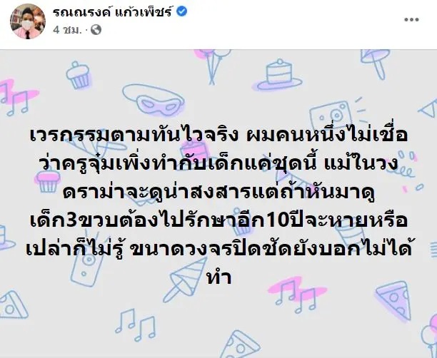 7 ต.ค. 63 ทนายรณณรงค์ หรือ นายรณณรงค์ แก้วเพ็ชร์ โพสต์เฟซบุ๊กส่วนตัวระบุข้อความว่า “เวรกรรมตามทันไวจริง ผมคนหนึ่งไม่เชื่อว่าครูจุ๋มเพิ่งทำกับเด็กแค่ชุดนี้ แม้ในวงดราม่าจะดูน่าสงสารแต่ถ้าหันมาดูเด็ก 3 ขวบต้องไปรักษาอีก 10 ปีจะหายหรือเปล่าก็ไม่รู้ ขนาดวงจรปิดชัดยังบอกไม่ได้ทำ”