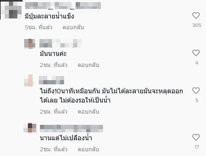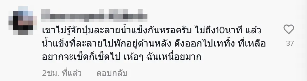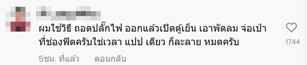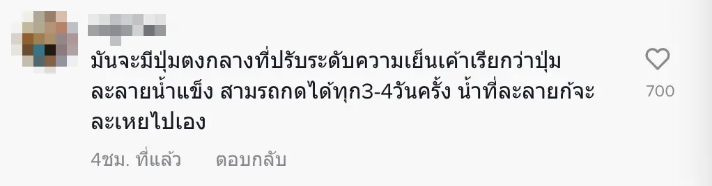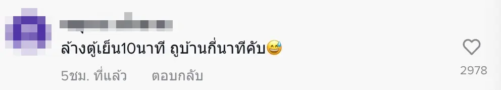 งานนี้ทำเอาชาวเน็ตต่างพากันออกความเห็นภายในโพสต์ซึ่งก็มีให้กดปุ่มละลาย แต่บางรุ่นเก่าแล้วก็มีไม่มีปุ่มทำละลาย โดยต่างออกความเห็นภายในโพสต์ว่า ล้างตู้เย็น10นาที ถูบ้านกี่นาทีคับ, ผมใช้วิธี ถอดปลั๊กไฟ ออกแล้วเปิดตู้เย็น เอาพัดลม จ่อเป่าที่ช่องฟิตครับใช่เวลา แปป เดียว ก็ละลาย หมดครับ, มันจะมีปุ่มตงกลางที่ปรับระดับความเย็นเค้าเรียกว่าปุ่มละลายน้ำแข็ง สามรถกดได้ทุก3-4วันครั้ง น้ำที่ละลายก้จะละเหยไปเอง, มีปุ่มละลายน้ำแข็ง, เขาไม่รู้จักปุ่มละลายน้ำแข็งกันหรอครับ ไม่ถึง10นาที แล้วน้ำแข็งที่ละลายไปพักอยู่ด้านหลัง ดึงออกไปเททิ้ง ที่เหลืออยากจะเช็ดก็เช็ดไป เห้อๆ ฉันเหนื่อยมาก, มันไม่มีกดปุ่มละลายหรอคะ ที่บ้านกดปุ่มทิ้งไว้เช้ามาหลุดหมด แต่ปกติไม่รอให้ติดหนาขนาดนี้ค่ะ, รุ่นเก่าบางรุ่นไม่มีค่ะ ที่บ้านก็ไม่มีค่ะ