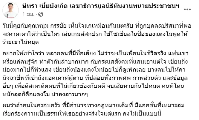 อยากให้เข้าใจว่า หลายคนที่มีชื่อเสียง ไม่ว่าจะเป็นเพื่อนในชีวิตจริง แฟนเขา หรือแค่คนรู้จัก ทำตัวกันลำบากมาก กับกระแสสังคมที่แสนเอาแต่ใจ เขียนถึงน้องมากไปก็หิวแสง เขียนถึงน้องแตงโมน้อยไปก็ดูเพิกเฉย บางคนไปให้ค่ามิจฉาชีพที่เข้าถึงแอคเคาท์ผู้ตาย ที่ปล่อยทั้งภาพศพ ภาพส่วนตัว และข้อมูลอื่นๆ เพื่อดิสเครดิตคนที่ไม่เกี่ยวข้องกับคดี จนเสียหายกันไปหมด คนที่โดนหนักสุดก็คือแตงโม น่าสงสารมากๆ
