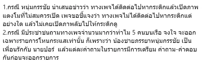 2.กรณี มีประชาชนถามทางเพจจำนวนมากว่าทำไม 5 คนบนเรือ จงใจ จะออกเฉพาะรายการโหนกระแสเท่านั้น ก็เพราะว่า น้องชายภรรยาหนุ่มกรรชัย เป็นเพื่อนรักกับ นายปอร์ แล้วแต่ละคำถามในรายการมีการเตรียม คำถาม-คำตอบ กันก่อนจะออกรายการ