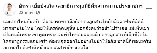 แม่แบบไหนกันครับ ที่สามารถขายมือถือของลูกสาวให้กับมิจฉาชีพที่มีคดีมากมายในไทย โดยให้เครดิตคนๆนั้น บอกสังคมว่าอย่าไปว่าเลย แม่เห็นเขาเป็นคนดีเพราะเขาพูดเพราะ จนทำให้ข้อมูลส่วนตัว ของลูกสาวที่เสียชีวิตในโศกนาฏกรรมแสนเศร้า ต้องหลุดออกไปอย่างไม่น่าให้อภัย ชาตินี้ก็พอนะครับ อย่าขอไปถึงชาติหน้าเลย สงสารน้องแตงโม
