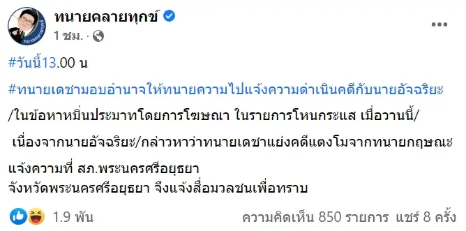 ล่าสุด เพจเฟซบุ๊ก ทนายคลายทุกข์ ได้มีการเคลื่อนไว้โพสต์ข้อความระบุว่า “ทนายเดชา”มอบอำนาจให้ทนายความไปแจ้งความดำเนินคดีกับนายอัจฉริยะ ในข้อหาหมิ่นประมาทโดยการโฆษณา ในรายการโหนกระแส เมื่อวานนี้ เนื่องจาก “นายอัจฉริยะ” กล่าวหาว่าทนายเดชาแย่งคดีแตงโมจาก “ทนายกฤษณะ” โดยจะแจ้งความที่ สภ.พระนครศรีอยุธยา