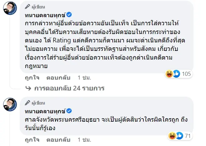 พร้อมให้ข้อมูลเพิ่มเติมว่า “การกล่าวหาผู้อื่นด้วยข้อความอันเป็นเท็จ เป็นการใส่ความให้บุคคลอื่นได้รับความเสียหายต้องรับผิดชอบในการกระทำของตนเอง ได้ Rating แต่คดีความก็ตามมา ผมจะดำเนินคดีถึงที่สุดไม่ยอมความ เพื่อจะได้เป็นบรรทัดฐานสำหรับสังคม เกี่ยวกับเรื่องการใส่ร้ายผู้อื่นด้วยข้อความเท็จต้องถูกดำเนินคดีตามกฎหมาย ศาลจังหวัดพระนครศรีอยุธยา จะเป็นผู้ตัดสินว่าใครผิดใครถูก ถึงวันนั้นก็รู้เอง”