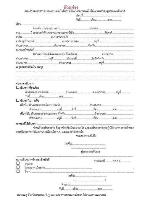 ทั้งนี้ ให้ขอเอกสารรับรอง ที่ว่าการอำเภอต้นทาง ส่วนรูปแบบอาจแตกต่างกันตามแต่ละจังหวัด ตัวอย่างคำขอเอกสารเดินทางฯ ตามภาพ ต้องใช้แบบฟอร์มด้านล่าง แบบฟอร์มที่มีตราครุฑ สำหรับประชาชนทั่วไปใช้ขอที่ที่ว่าการอำเภอ เทศบาล อบต. หรือที่ทำการกำนันผู้ใหญ่บ้าน ในพื้นที่