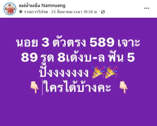 อย่างไรก็ตาม ก่อนหน้านี้ แม่น้ำหนึ่ง ได้โพสต์ข้อความเมื่อวันที่ 25 สิงหาคมที่ผ่านมา ระบุว่า นอย 3 ตัวตรง 589, เจาะ 89, รูด 8 เด้งบ-ล, ฟัน 5 ใครได้บ้างคะ ซึ่งมีแฟนคลับบางส่วนได้โชคจากแม่น้ำหนึ่งไปเต็มๆ