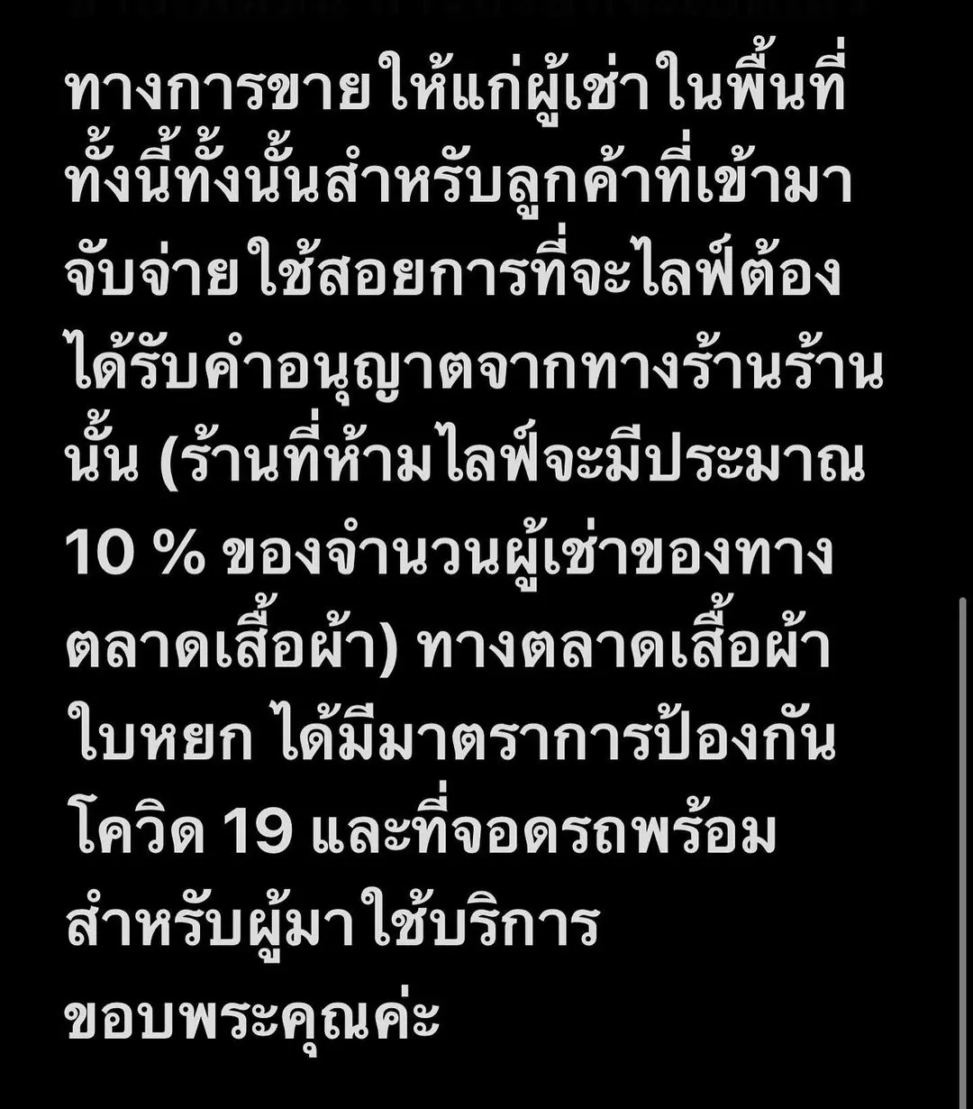 ทั้งนี้ทั้งนั้นสําหรับลูกค้าที่เข้ามาจับจ่ายใช้สอย การที่จะไลฟ์ต้องได้รับคำอนุญาตจากทางร้านร้านนั้น (ร้านที่ห้ามไลฟ์จะมีประมาณ 10% ของจำนวนผู้เช่าของทางตลาดเสื้อผ้า) ทางตลาดเสื้อผ้าใบหยก ได้มีมาตราการป้องกัน โควิด 19 และที่จอดรถพร้อมสำหรับผู้มาใช้บริการ ขอบพระคุณค่ะ