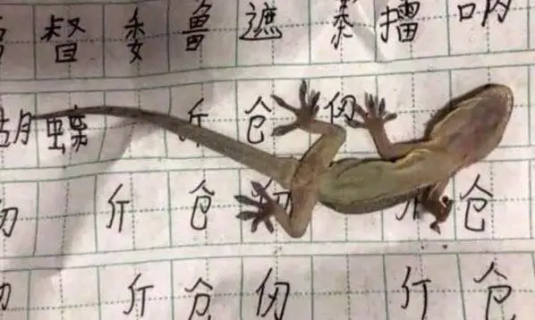 “ จิ้งจก ” ที่นอนเป็นซากอยู่บนการบ้านของเด็กชายรายนี้ ซึ่งเด็กชายไม่ทราบเลยว่าจิ้งจกตัวนี้มาจากไหน มาเมื่อไหร่ ตายยังไงและเขานอนทับมันจนแบนมานานแค่ไหนแล้ว