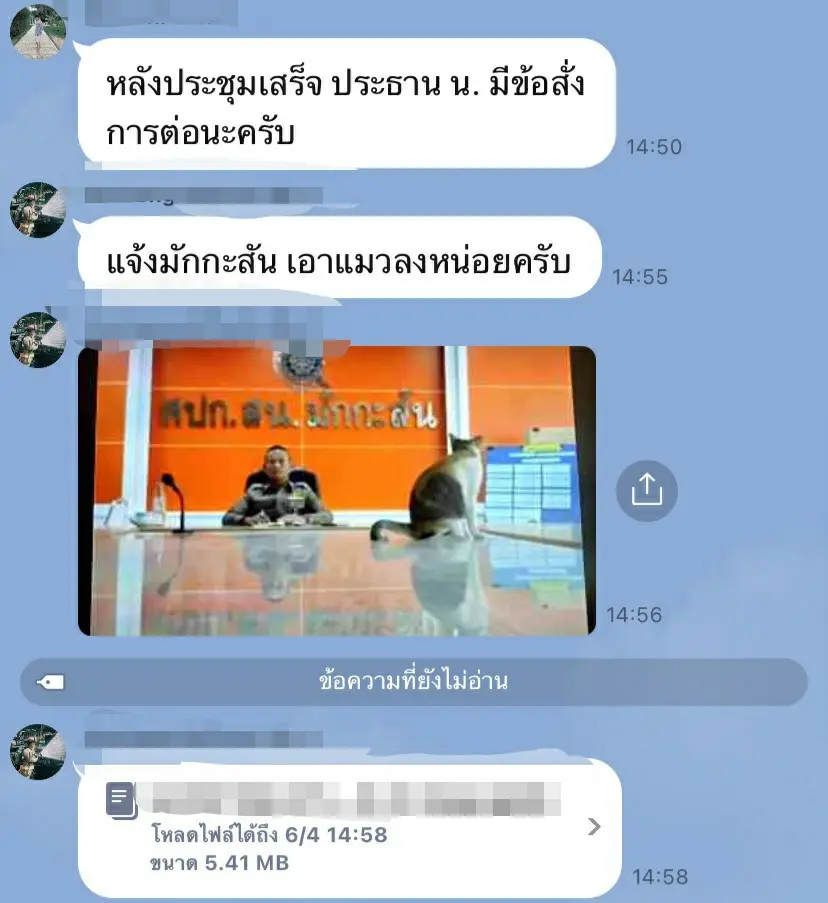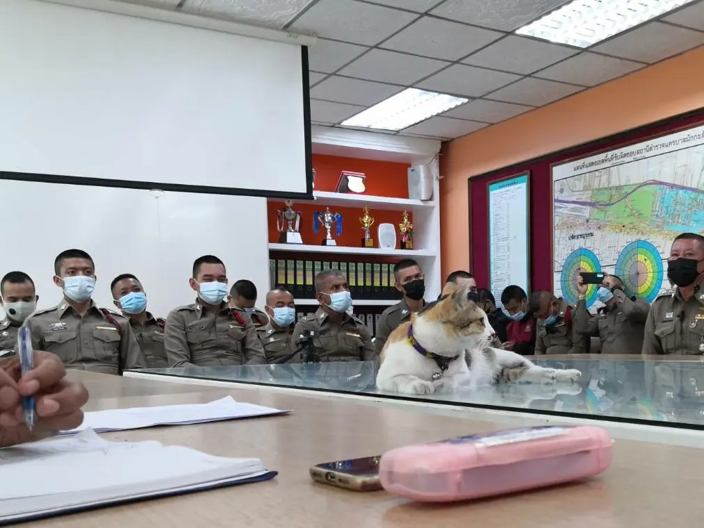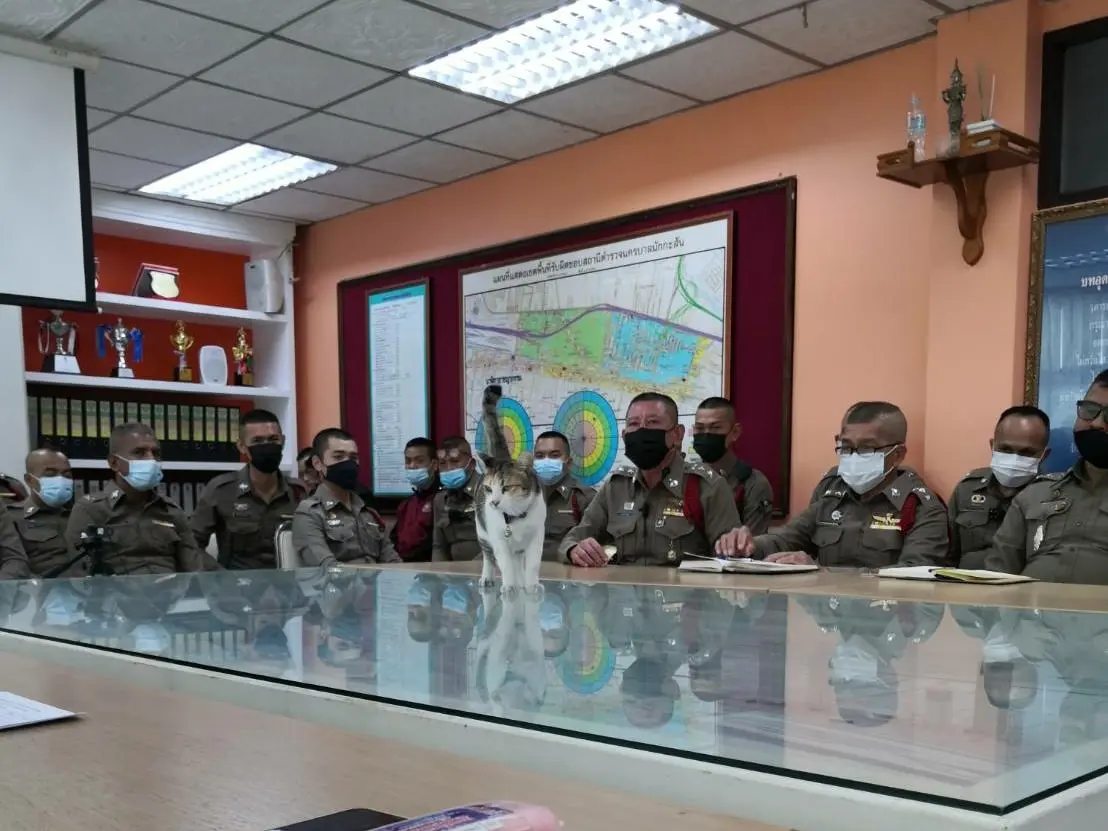 เจ้าใบสั่ง แมวโรงพัก ขาใหญ่ประจำสน.มักกะสัน กระโดดขึ้นโต๊ะร่วมประชุมบริหารประจำเดือนของโรงพัก เจ้าหน้าที่เอ็นดูไม่ไล่ลง ให้ประชุมด้วย