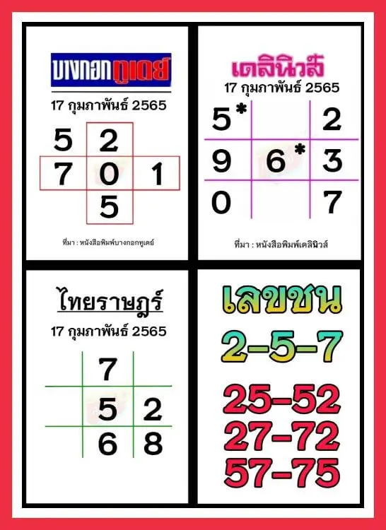 ปล่อยออกมาแล้ว อยากปังต้องรีบดู! เลขเด็ดจากหนังสือพิมพ์ดัง ไทยราษฎร์ เดลินิวส์ บางกอกทูเดย์ งวดวันที่ 17 กุมภาพันธ์ 2565 ชนจังๆ 2-5-7