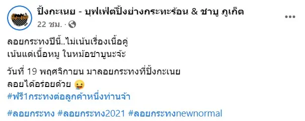 “ลอยกระทงปีนี้..ไม่เน้นเรื่องเนื้อคู่ เน้นแต่เนื้อหมู ในหม้อชาบูนะจ้ะ วันที่ 19 พฤศจิกายน มาลอยกระทงที่ปิ้งกะเนย ลอยได้อร่อยด้วย #ฟรี1กระทงต่อลูกค้าหนึ่งท่านจ้า”
